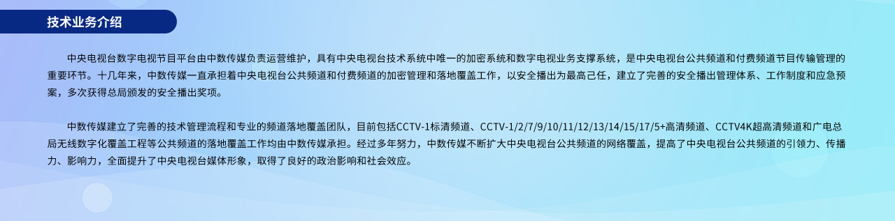 中央數(shù)字電視傳媒有限公司(簡稱“中數(shù)傳媒”),成立于2003年10月,是中央廣播電視總臺旗下覆蓋全國范圍、多渠道、多終端的付費電視頻道集成及全媒體運營平臺。